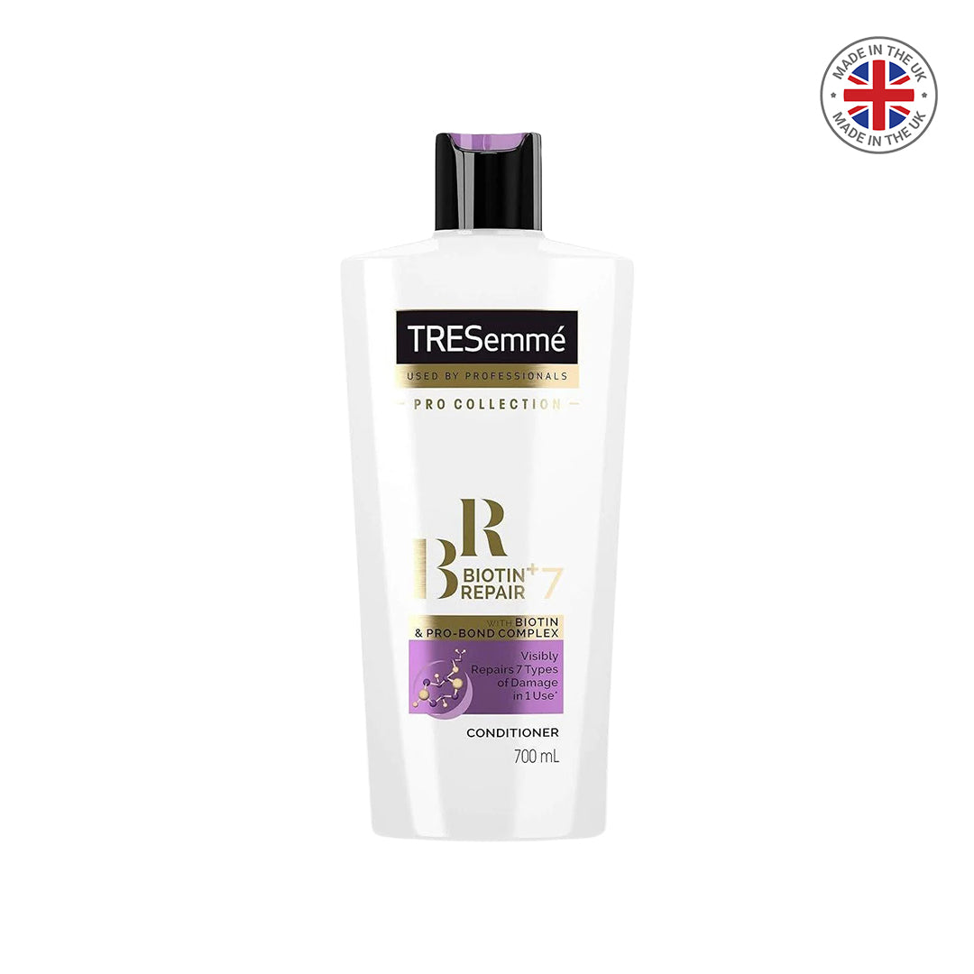TRESemmé Biotin+ Repair Conditioner combines Biotin & Pro-Bond Complex to restore compromised hair structure. This 700 ml formula works internally to repair broken bonds caused by thermal styling, chemical treatments, & environmental stress. Its multi-action system simultaneously addresses various damage types, making it especially suited for color-processed, bleached, or heat-damaged hair. Used alongside the matching shampoo, it optimizes hydration levels & restores natural elasticity. Consistent use reinforces the hair matrix from within, enhancing both strength & surface quality. The result is noticeably more resilient strands with improved shine, texture, & styling performance.