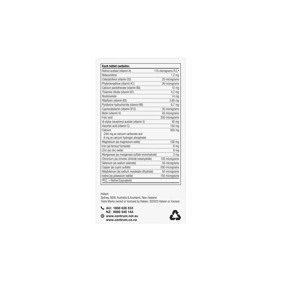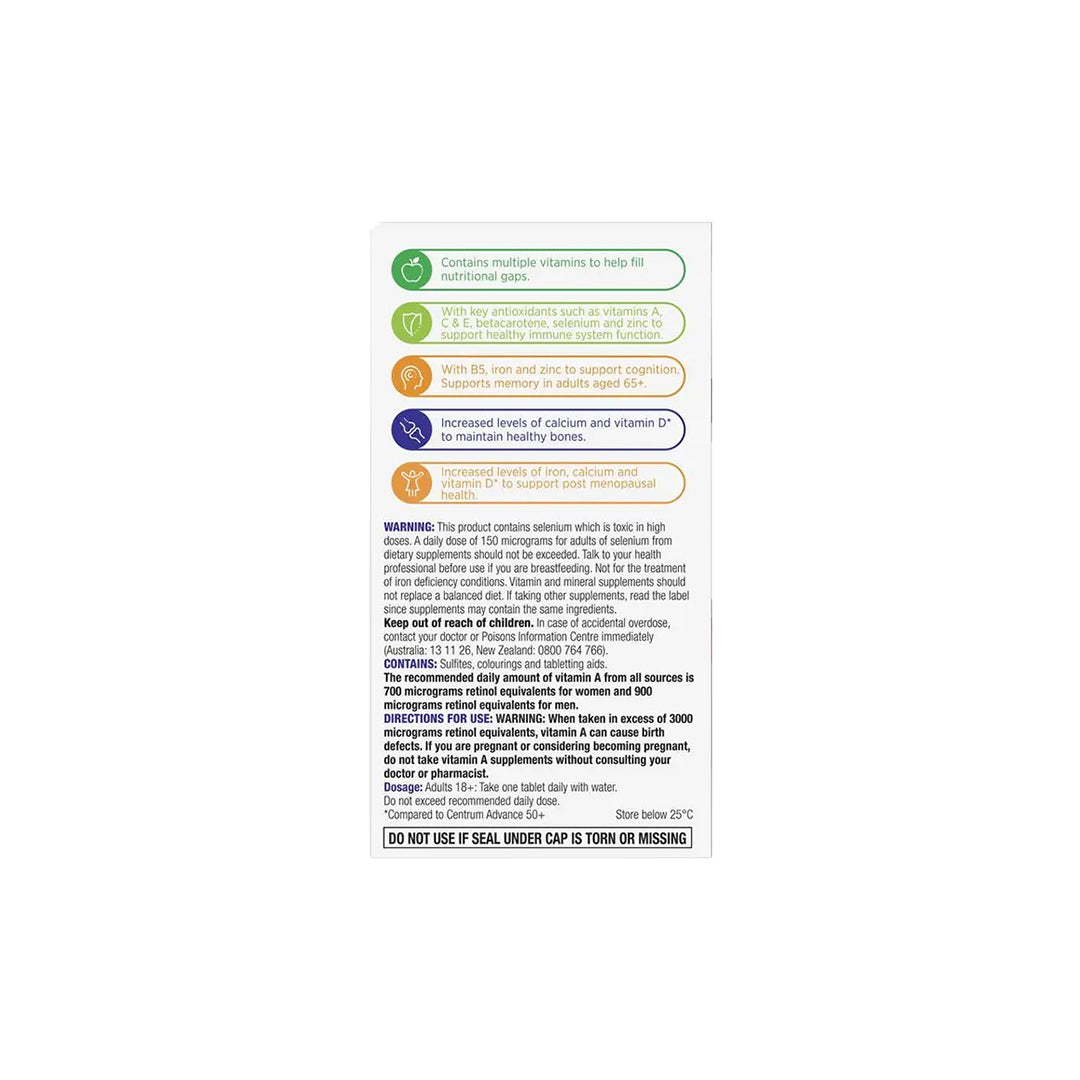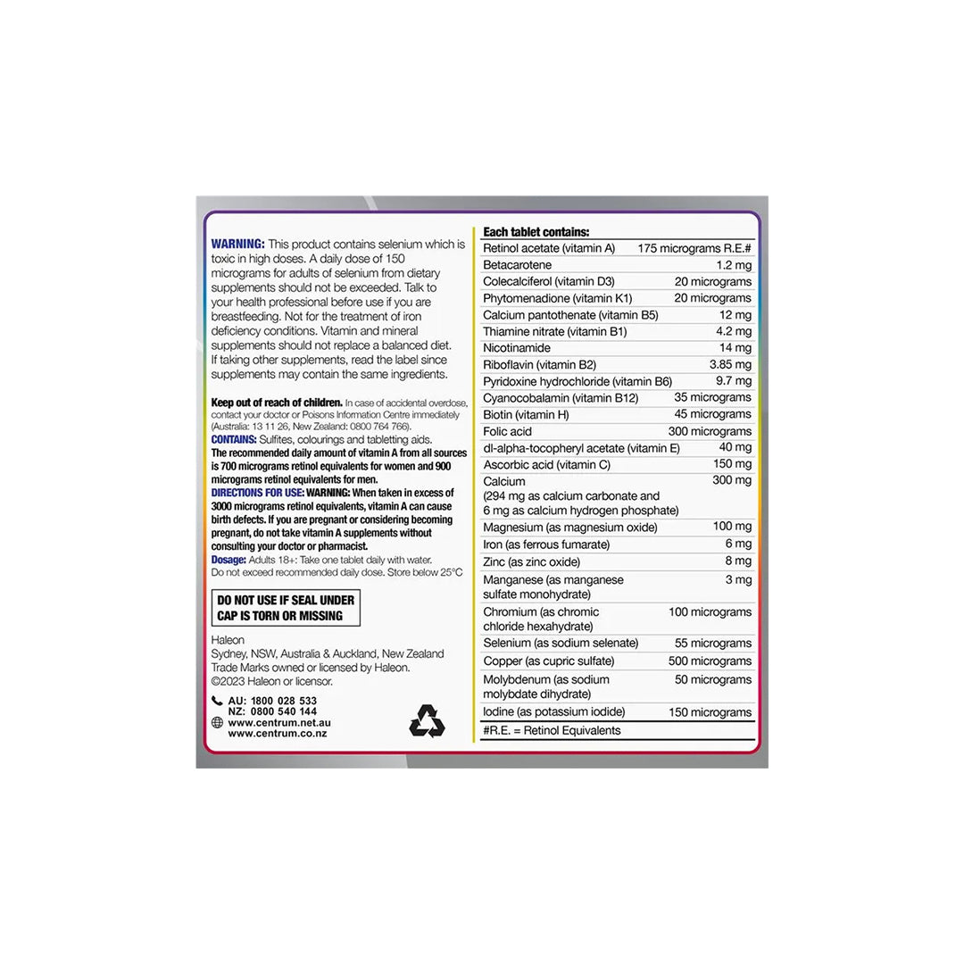 This Centrum product is specifically formulated for women who are 50 years old or older. It is packed with essential nutrients & vitamins necessary for maintaining a healthy body. With biotin to support healthy skin and hair, selenium for strong nails, vitamin B6 to regulate hormones, & vitamin B12 for proper nervous system function, this formula is designed for optimal well-being. Additionally, vitamin D is included to maintain strong bones & teeth.