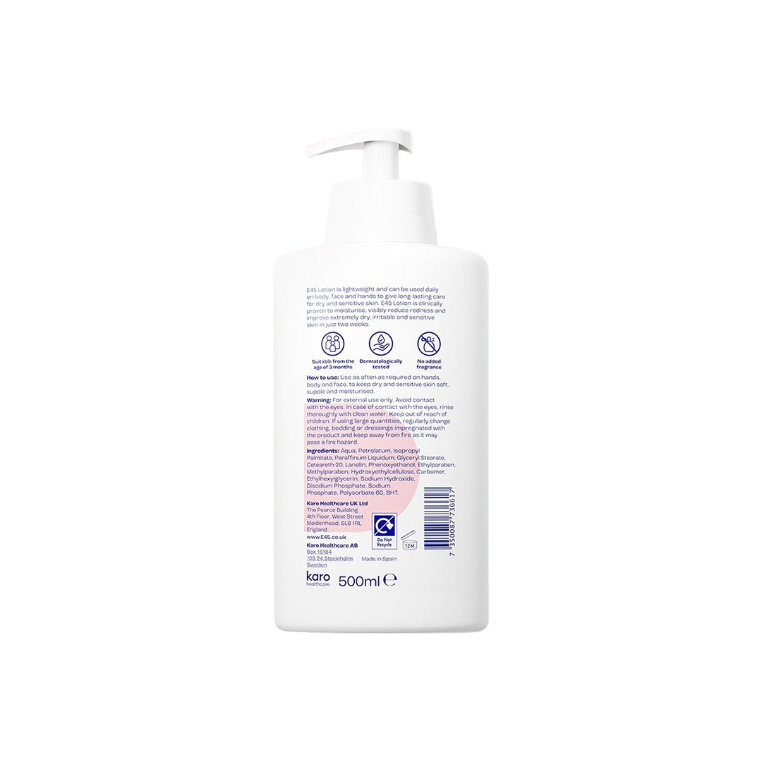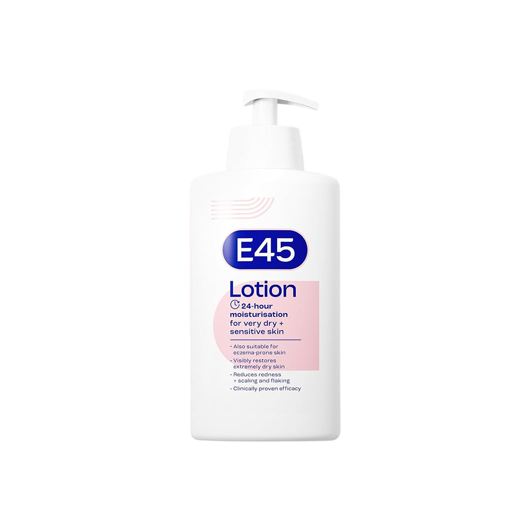 E45 Moisturising Lotion is a lightweight, fragrance-free formula designed for use on the body, face, & hands, providing prolonged care for dry & sensitive skin. It includes occlusive agents that help to soften & smooth the skin while preserving optimal moisture levels. This gentle lotion is appropriate for all ages, including infants, making it ideal for daily use on dry & sensitive skin.