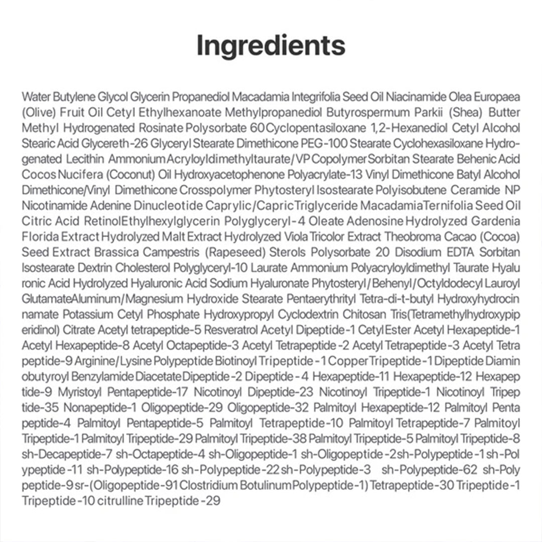 Water, Butylene Glycol, Glycerin, Propanediol, Macadamia Integrifolia Seed Oil, Niacinamide, Olea Europaea (Olive) Fruit Oil, Cetyl Ethylhexanoate, Methylpropanediol, Butyrospermum Parkii (Shea) Butter, Methyl Hydrogenated Rosinate, Polysorbate 60, Cyclopentasiloxane, 1,2-Hexanediol, Cetyl Alcohol, Stearic Acid, Glycereth-26, Glyceryl Stearate, Dimethicone, PEG-100 Stearate, Cyclohexasiloxane, Hydrogenated Lecithin, Ammonium Acryloyldimethyltaurate/VP Copolymer, Sorbitan Stearate, Behenic Acid, Cocos Nucifera (Coconut) Oil, Hydroxyacetophenone, Polyacrylate-13, Vinyl Dimethicone, Batyl Alcohol, Dimethicone/Vinyl Dimethicone Crosspolymer, Phytosteryl Isostearate, Polyisobutene, Ceramide NP, Nicotinamide Adenine Dinucleotide, Caprylic/Capric Triglyceride, Macadamia Ternifolia Seed Oil, Citric Acid, Retinol, Ethylhexylglycerin, Polyglyceryl-4 Oleate, Adenosine, Hydrolyzed Gardenia Florida Extract, Hydrolyzed Malt Extract, Hydrolyzed Viola Tricolor Extract, Theobroma Cacao (Cocoa) Seed Extract, Brassica Campestris (Rapeseed) Sterols, Polysorbate 20, Disodium EDTA, Sorbitan Isostearate, Dextrin, Cholesterol, Polyglyceryl-10 Laurate, Ammonium Polyacryloyldimethyl Taurate, Hyaluronic Acid, Hydrolyzed Hyaluronic Acid, Sodium Hyaluronate, Phytosteryl/Behenyl/Octyldodecyl Lauroyl Glutamate, Aluminum/Magnesium Hydroxide Stearate, Pentaerythrityl Tetra-di-t-butyl Hydroxyhydrocinnamate, Potassium Cetyl Phosphate, Hydroxypropyl Cyclodextrin, Chitosan, Tris(Tetramethylhydroxypiperidinol) Citrate, Acetyl tetrapeptide-5, Resveratrol, Acetyl Dipeptide-1 Cetyl Ester, Acetyl Hexapeptide-1, Acetyl Hexapeptide-8, Acetyl Octapeptide-3, Acetyl Tetrapeptide-2, Acetyl Tetrapeptide-3, Acetyl Tetrapeptide-9, Arginine/Lysine Polypeptide, Biotinoyl Tripeptide-1, Copper Tripeptide-1, Dipeptide Diaminobutyroyl Benzylamide Diacetate, Dipeptide-2, Dipeptide-4, Hexapeptide-11, Hexapeptide-12, Hexapeptide-9, Myristoyl Pentapeptide-17, Nicotinoyl Dipeptide-23, Nicotinoyl Tripeptide-1, Nicotinoyl Tripeptide-35, Nonapeptide-1, Oligopeptide-29, Oligopeptide-32, Palmitoyl Hexapeptide-12, Palmitoyl Pentapeptide-4, Palmitoyl Pentapeptide-5, Palmitoyl Tetrapeptide-10, Palmitoyl Tetrapeptide-7, Palmitoyl Tripeptide-1, Palmitoyl Tripeptide-29, Palmitoyl Tripeptide-38, Palmitoyl Tripeptide-5, Palmitoyl Tripeptide-8, sh-Decapeptide-7, sh-Octapeptide-4, sh-Oligopeptide-1, sh-Oligopeptide-2, sh-Polypeptide-1, sh-Polypeptide-11, sh-Polypeptide-16, sh-Polypeptide-22, sh-Polypeptide-3, sh-Polypeptide-62, sh-Polypeptide-9, sr-(Oligopeptide-91 Clostridium Botulinum Polypeptide-1), Tetrapeptide-30, Tripeptide-1, Tripeptide-10 citrulline, Tripeptide-29