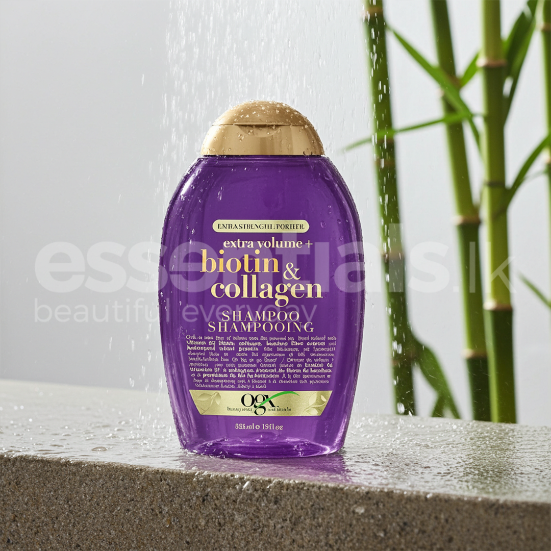 OGX Extra Strength Biotin & Collagen Shampoo delivers powerful volumizing results with a lightweight formula. Infused with biotin, collagen, bamboo fiber extract, & hydrolyzed wheat protein, it nourishes & thickens strands from root to tip. This sulfate-free, color-safe shampoo provides superior volume & shine compared to standard formulas. Designed for fine or thinning hair, it revitalizes flat strands & creates the appearance of fuller, healthier, more abundant locks with lasting body.