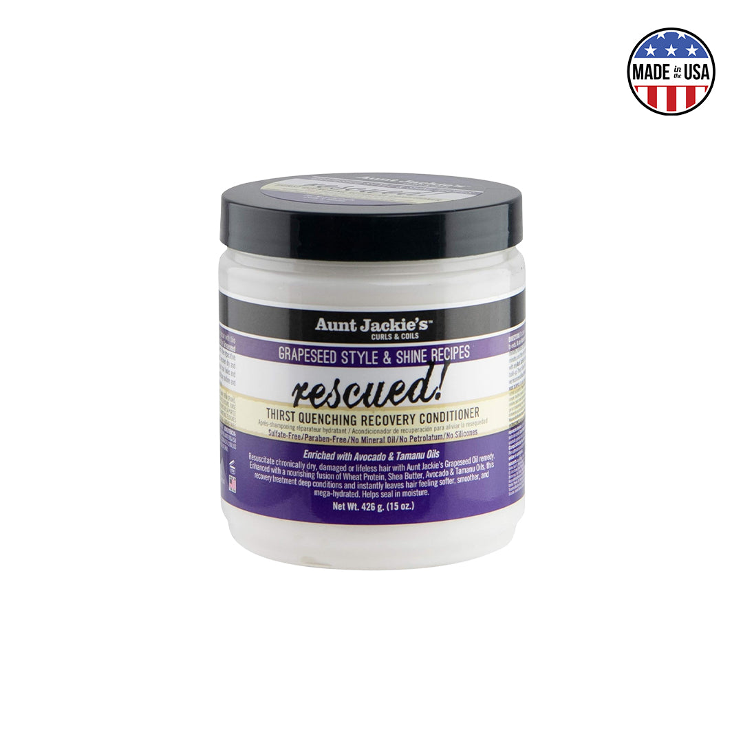 Aunt Jackie's Rescued! Thirst Quenching Recovery Conditioner combats severe moisture loss in weakened hair through precision-engineered conditioning technology. This potent formula rehydrates parched strands while simultaneously reinforcing their structural matrix to restore shine & resilience. Developed for hair in critical need of professional-caliber treatment to reclaim optimal hydration, flexibility, & health.
