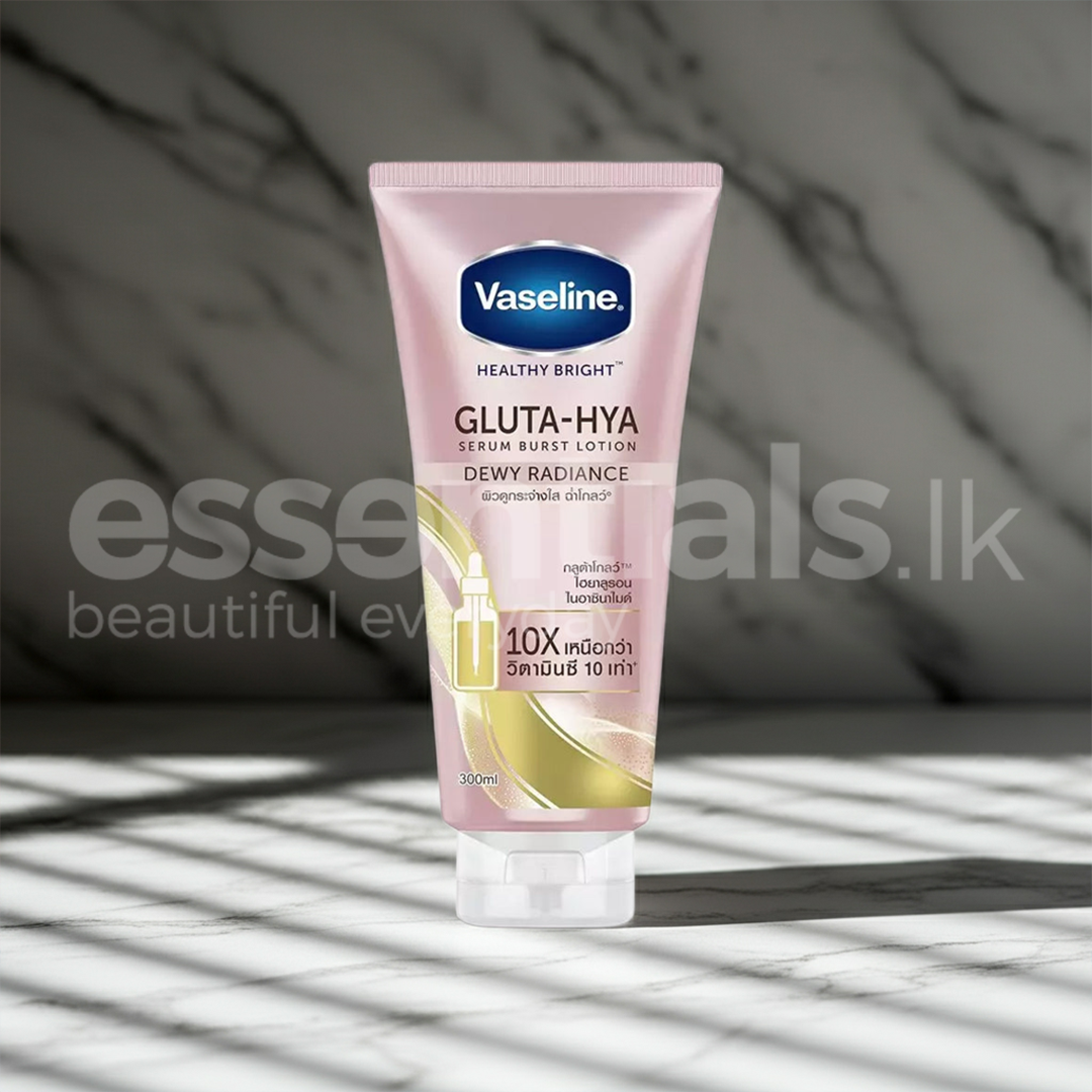 Experience the benefits of Vaseline Healthy Bright Gluta - Hya Serum Burst Lotion Dewy Radiance 300ml. This advanced body lotion utilizes Gluta Glow technology & Hyaluronic Acid to brighten & hydrate your skin. Its unique serum burst formula allows for deep penetration, providing ultimate moisture & enhancing your skin's natural radiance. The addition of Vaseline jelly micro-droplets helps to seal in moisture & strengthen your skin's protective barrier, shielding it from environmental damage. This versatile lotion is perfect for daily use & suitable for all skin types, even sensitive skin