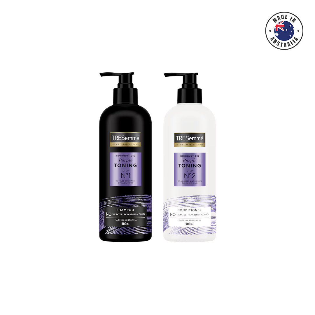 - Apply TREsemmé Purple Toning Shampoo to wet hair, lather then rinse thoroughly